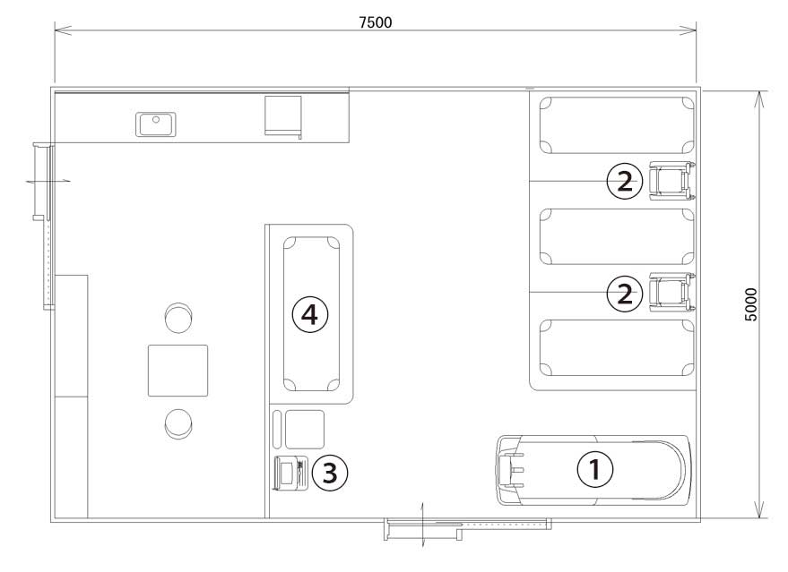 診療所 処置室・リハビリテーション室 プランA 参考レイアウト 番号 名 称数量 ①ベッド型マッサージ器(水圧式)1 ②低周波治療器・干渉電流型低周波治療器組合せ理学療法機器2 ③家庭用エアマッサージ器1 ④ウェルベッド4 レイアウトのご相談