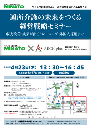 2026年4月23日(木)名古屋営業所セミナー開催のお知らせ 2026.03.23 セミナー 通所介護の未来をつくる経営戦略セミナー ー収支改善・成果が出るトレーニング・外国人採用までー セミナーの情報はこちら:652KB