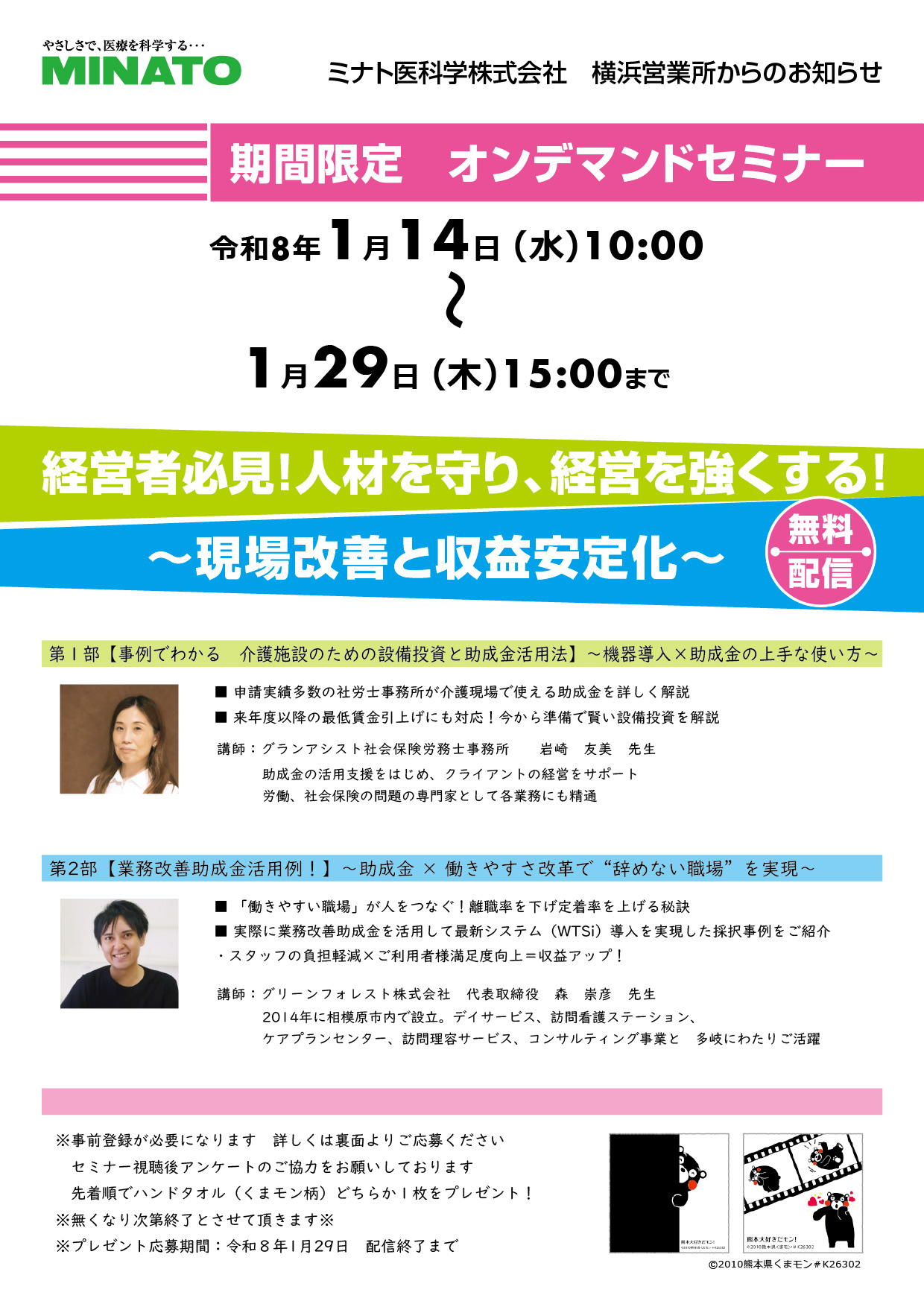 2026年1月14日~29日 横浜オンデマンドセミナー開催のお知らせ 2025.12.01 セミナー こんなお悩みありませんか? 通所リハ経営者必見! ~経営アップデートで選ばれる施設へ~ セミナーの情報はこちら:652KB
