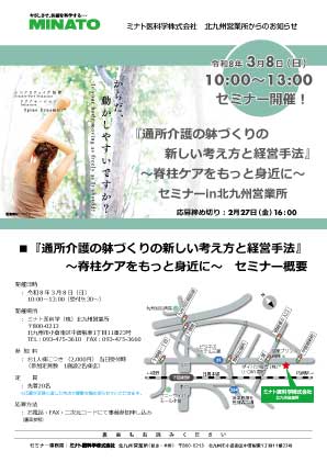 【受付終了】2026年3月8日(日)北九州営業所セミナー開催のお知らせ 2026.02.05 セミナー 通所介護の躰づくりの新しい考え方と経営手法 ー脊柱ケアをもっと身近にー セミナーの情報はこちら:652KB